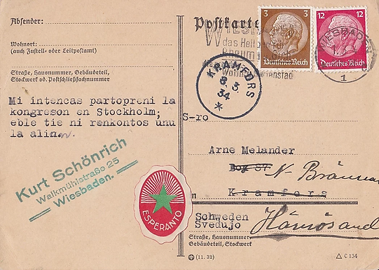 Postcard, featuring an 'Esperanto' label, sent from Wiesbaden to Kramfors (with redirection), in Sweden.