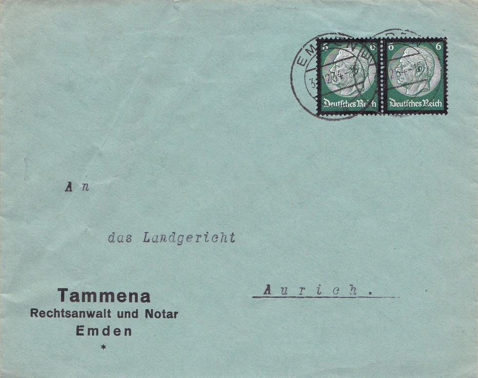 Commercial cover from 'Tammena' lawyer and notary, Emden, to 'das Landgericht' (county court) in Aurich. Featuring Hindenburg memorial stamp - Mi.550. Ref: 31.12.1934 - 9/57