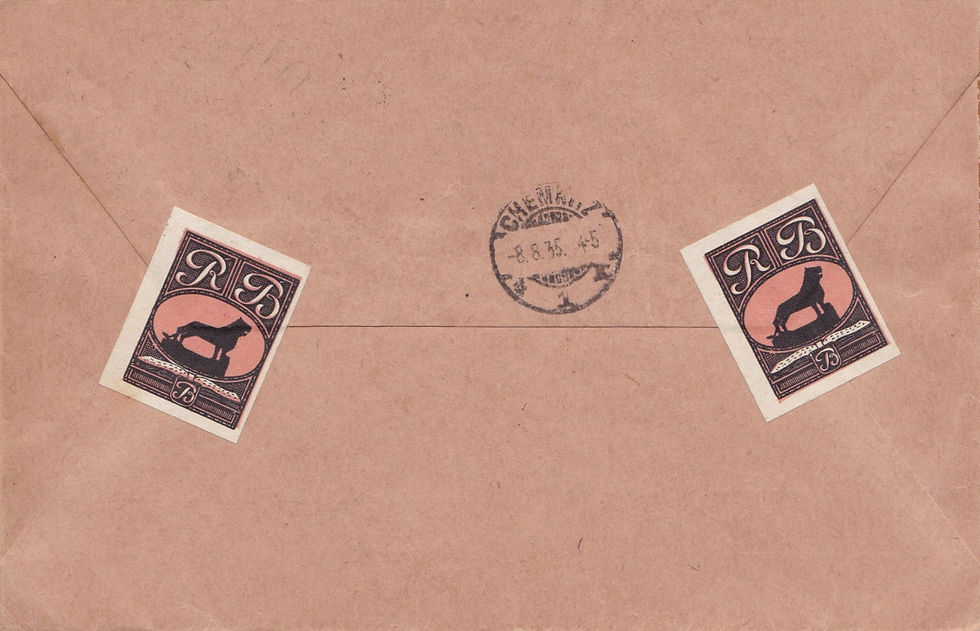 Commercial cover sent from the offices of Richard Borek in Braunschweig to a recipient in Chemnitz. With two vignettes featuring Borek's initials to the reverse. With stamp commemorating 100 years of the German railway - Mi.583. Ref: 07.08.1935 - 9/61