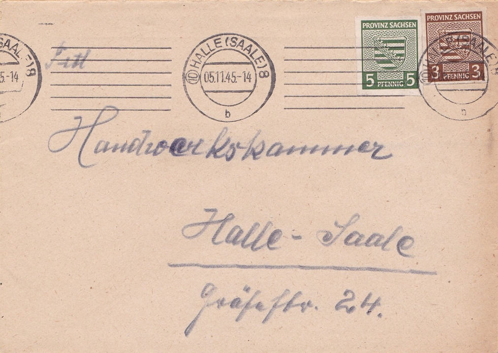Cover sent from Halle (Saale) to the Handwerkskammer (Chamber of Crafts )in Halle. Featuring stamps Mi.67 and Mi.68. Ref: 05.11.1945